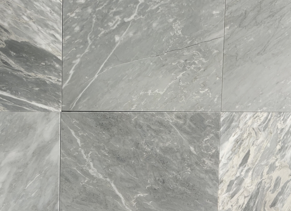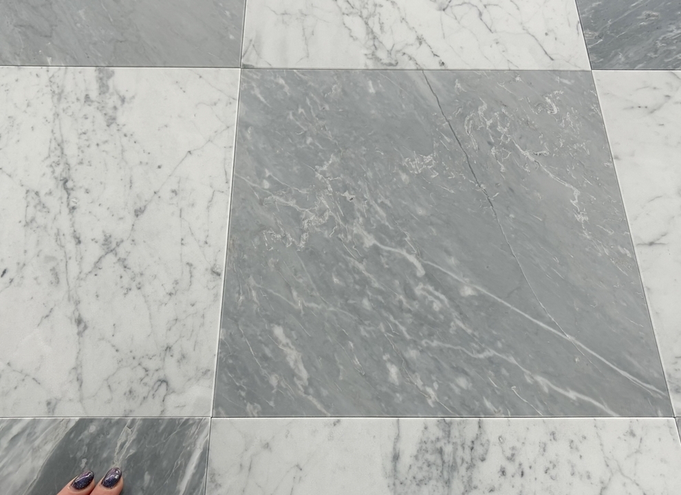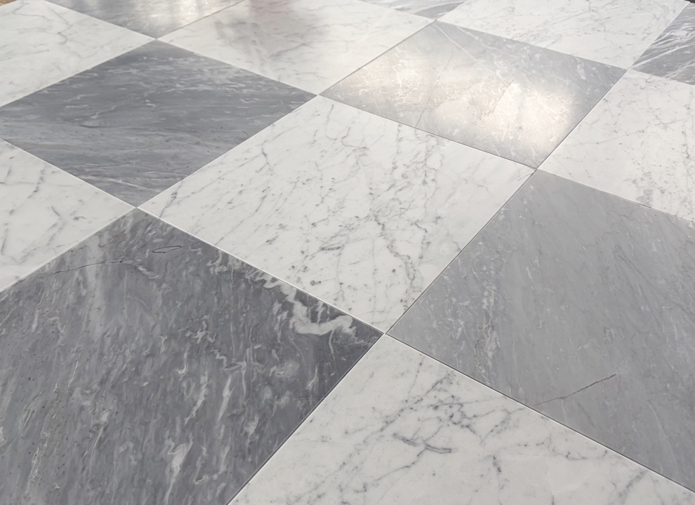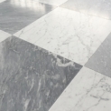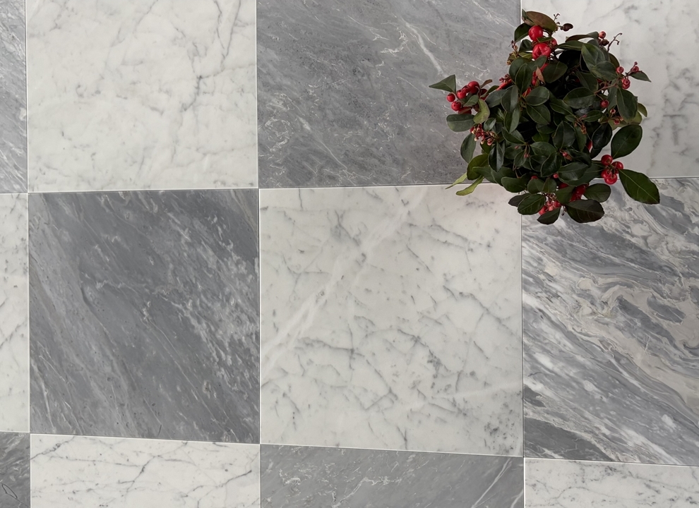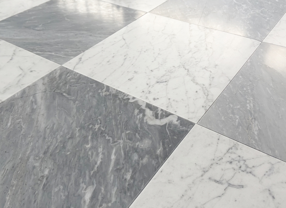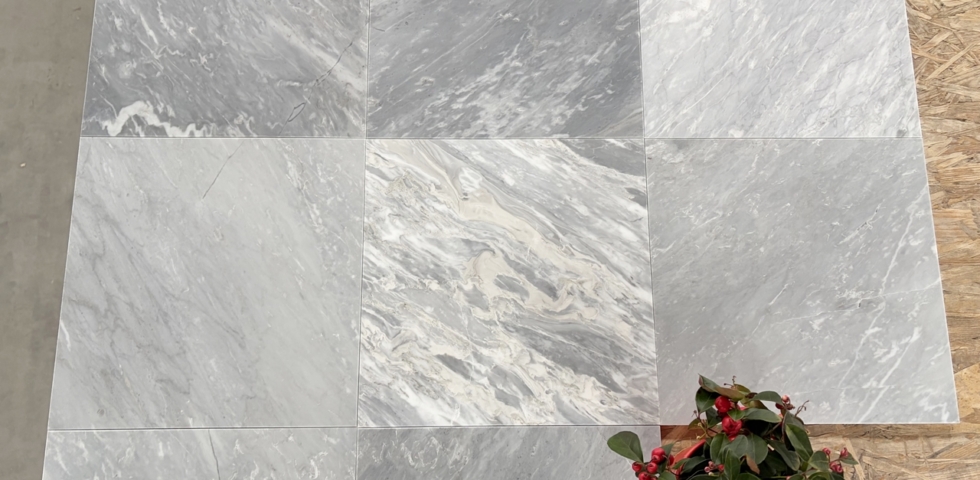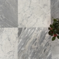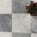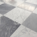 Bardiglio SH2 – świetnie sprawdzą się do szachownicy w połączeniu z klasyczną carrarą. W porównaniu z płytkami Bardiglio SH – poprzedniej wersji są bardziej intensywne, ciemniejsze, mają też żyły wpadające lekko w popiel, jasny beż.