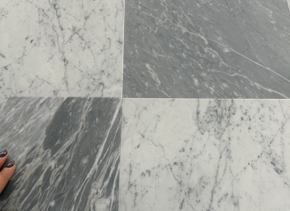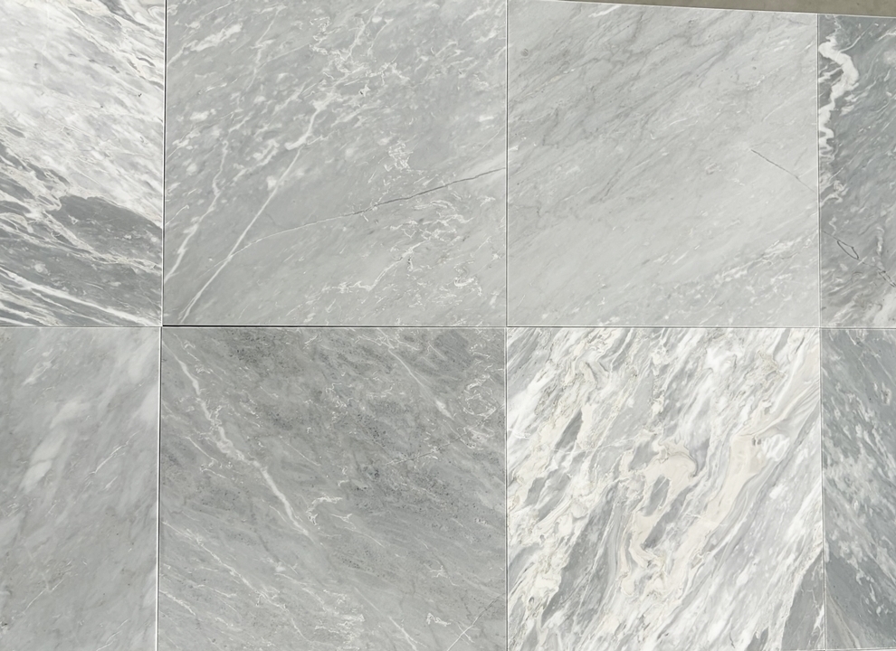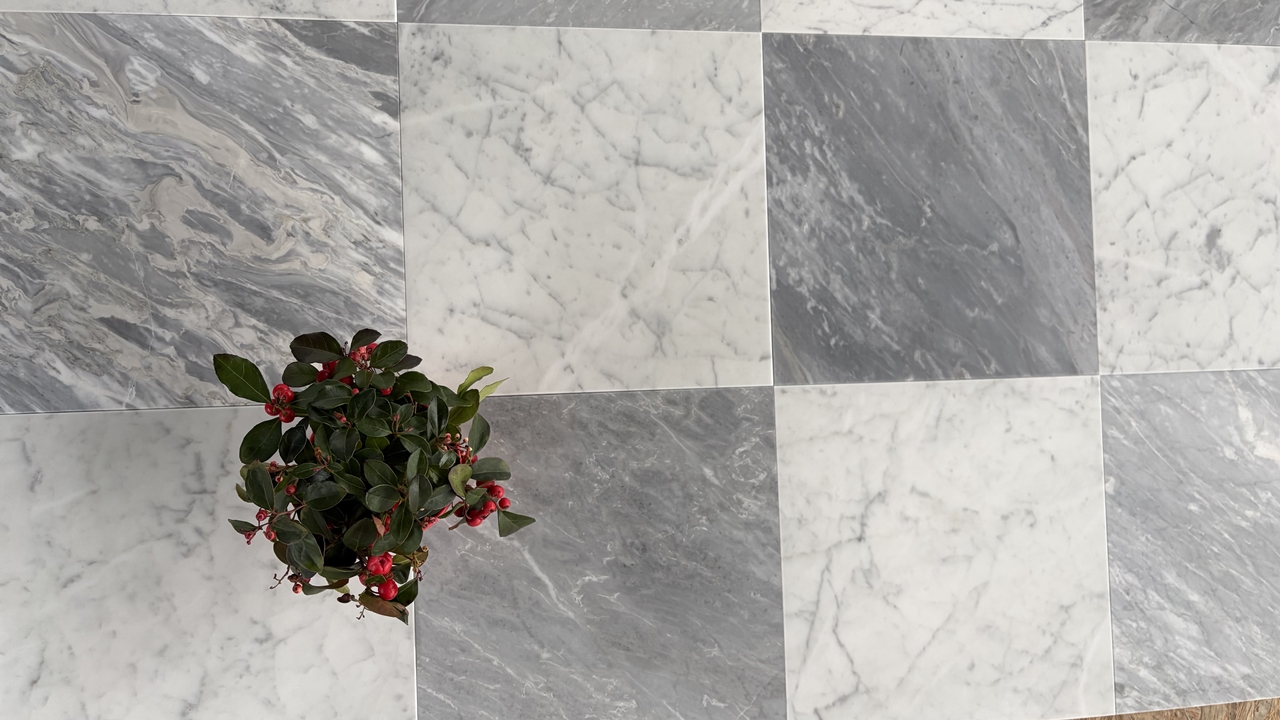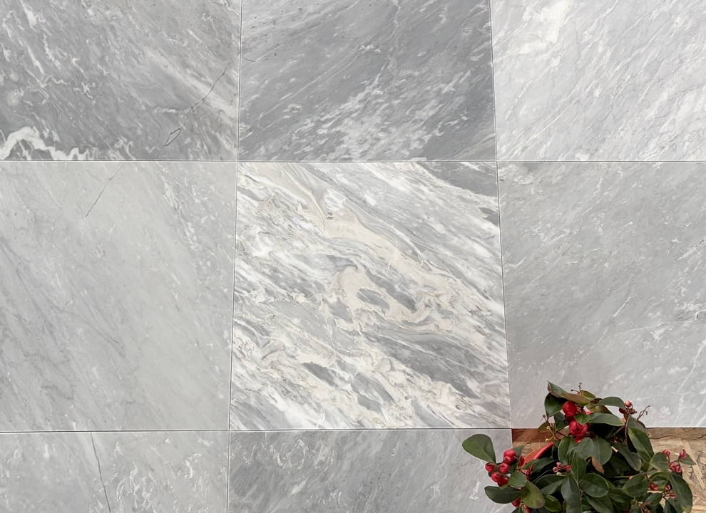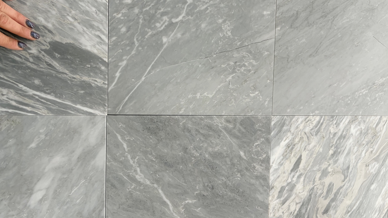 Bardiglio SH2 – świetnie sprawdzą się do szachownicy w połączeniu z klasyczną carrarą. W porównaniu z płytkami Bardiglio SH – poprzedniej wersji są bardziej intensywne, ciemniejsze, mają też żyły wpadające lekko w popiel, jasny beż.