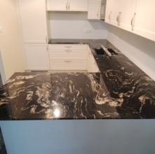 - Meble z ciemnego, twardego drewna np. mahoniu, dobrze łączą się z blatami granitowymi o jasnych, neutralnych barwach oraz dobrze współgrają ze złotymi żyłami i odcieniami materiału.