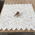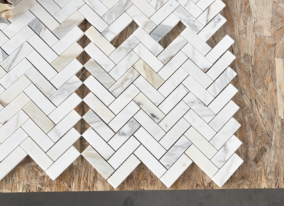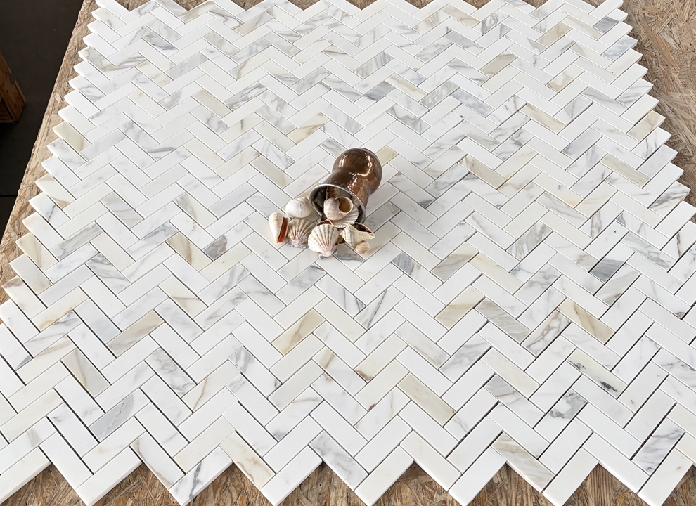 Jodełka Calacatta Gold mat – matowa wersja klasycznej jodełki z marmuru Calacatta Gold. Piękna, jasna, urozmaicona złotymi i szarymi żyłami, jak na Calacattę Gold przystoi.