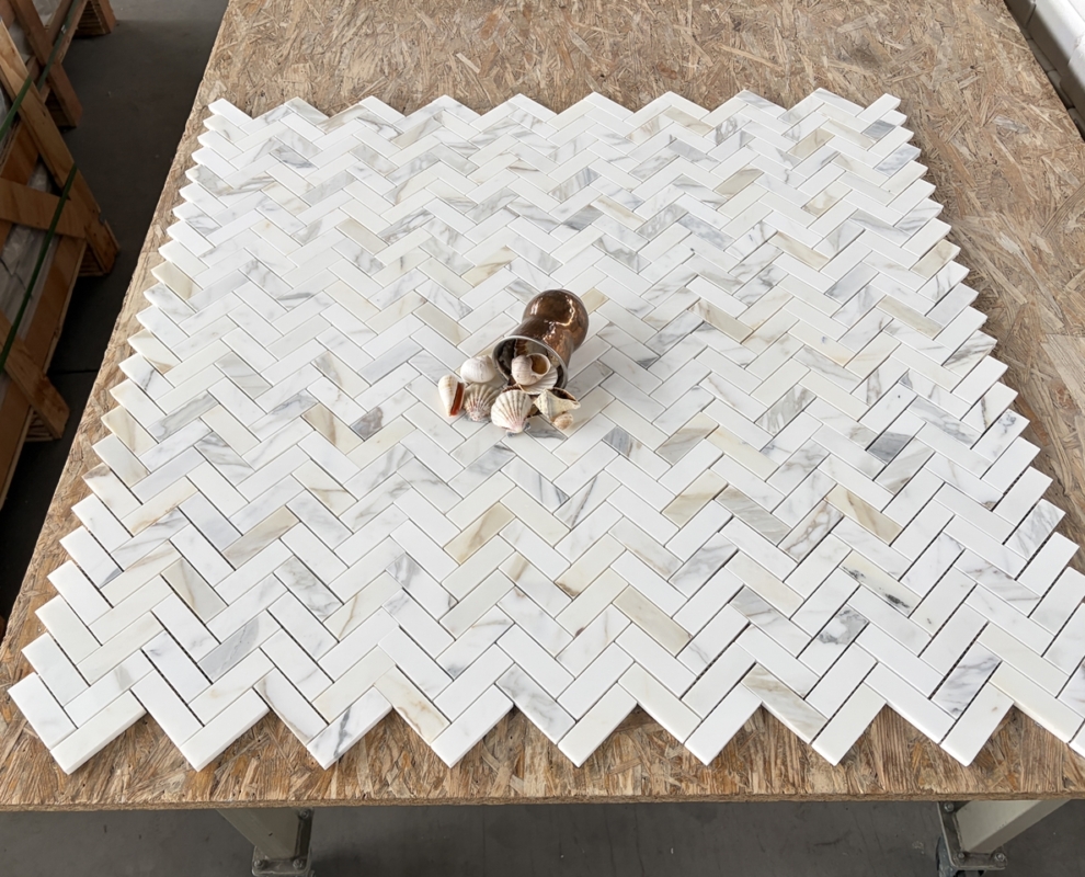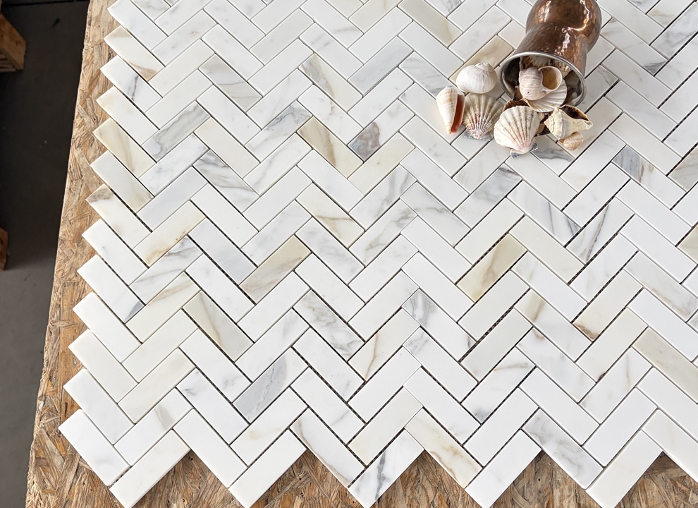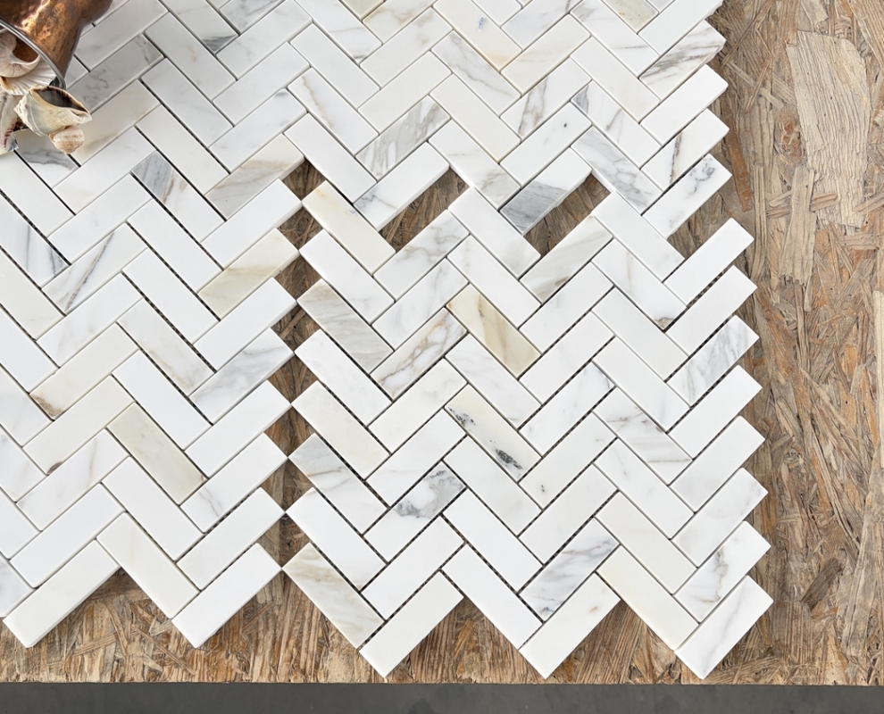 Wprowadź do wnętrza odrobinę włoskiego luksusu dzięki eleganckiej mozaice Calacatta Gold w jodełkę. Ten naturalny marmur, wydobywany w Toskanii, zachwyca klasycznym białym tłem przeplatanym subtelnymi, złocistymi i szaro-beżowymi żyłkami – każda płytka to unikatowa kompozycja natury.