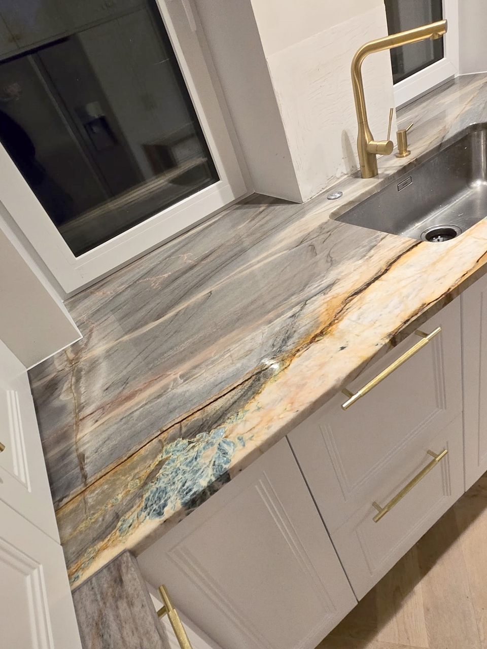 Z uwagi na swój charakter płyty z tego kwarcytu mają sporo wyczuwalnych w dotyku żyłek, wypełnionych żywicą, szczególnie na przełamaniu kolorów. Polecamy zobaczyć go u nas „na żywo” i omówić planowany projekt.