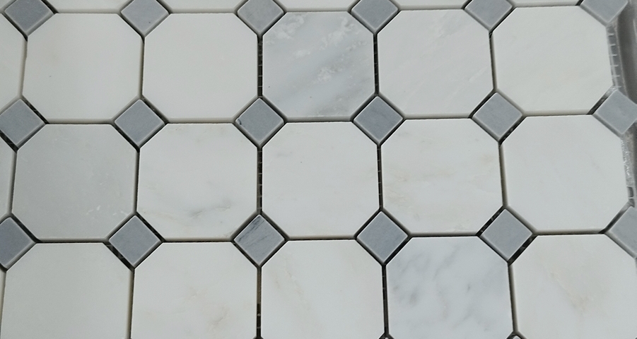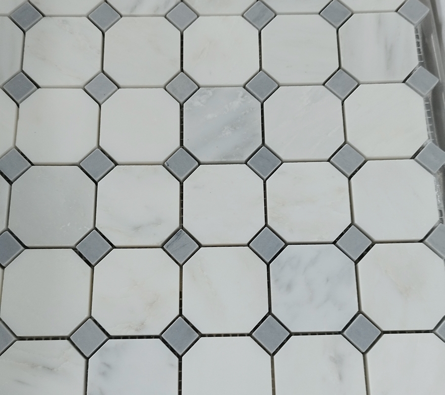 Mini Octagon Grey – matowa mozaika marmurowa o bardzo jasnym odcieniu. Łączy dwa marmury: Calacattę Fusion i Bardiglio. To eleganckie, delikatne zestawienie, które rozświetli każde wnętrze.