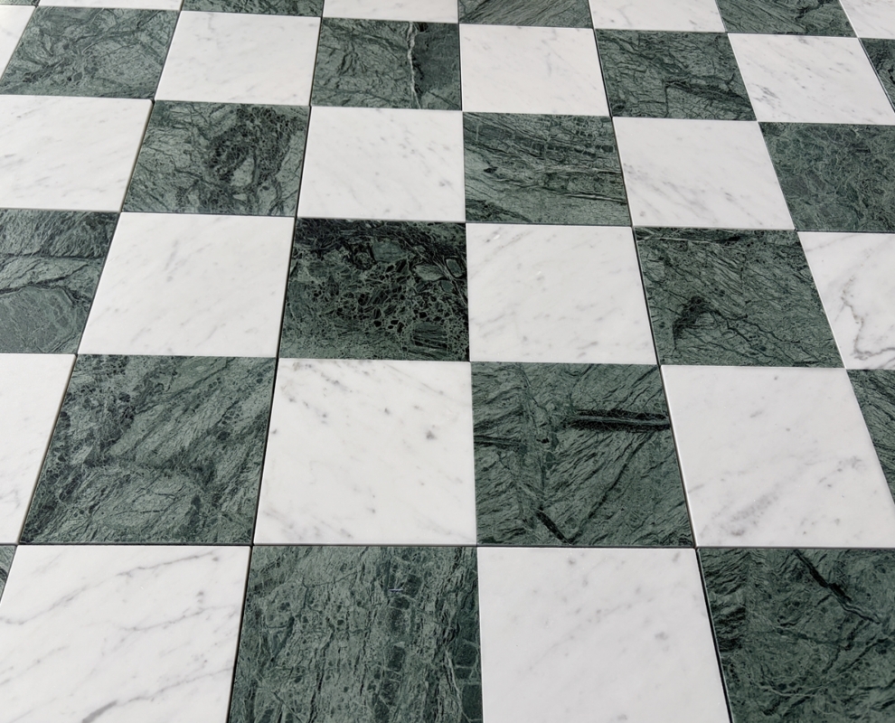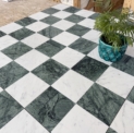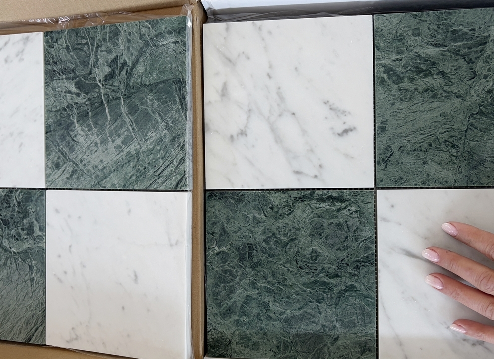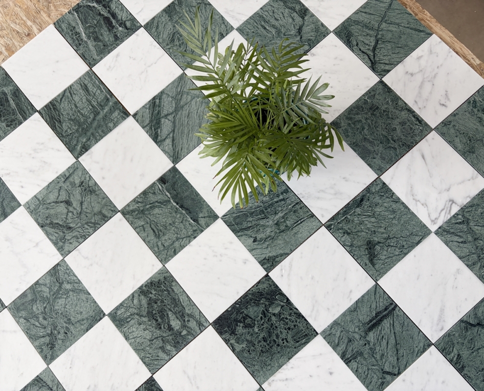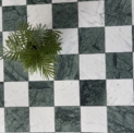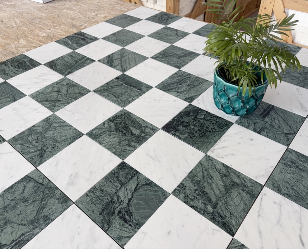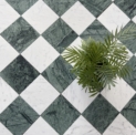 Szachownica Mini Verde – to połączenie dwóch marmurów, zielonego Verde Guatemala i białej Carrary. Piękna, mała szachownica na siatce. Po cztery kafle na siatce. Łatwa w montażu. Matowy, stonowany zielony i jasnoszare smugi na białym marmurze tworzą bardzo eleganckie i świeże połączenie.