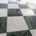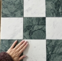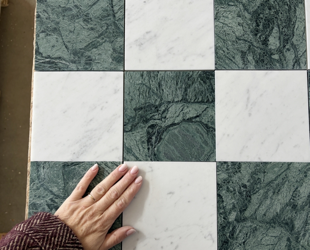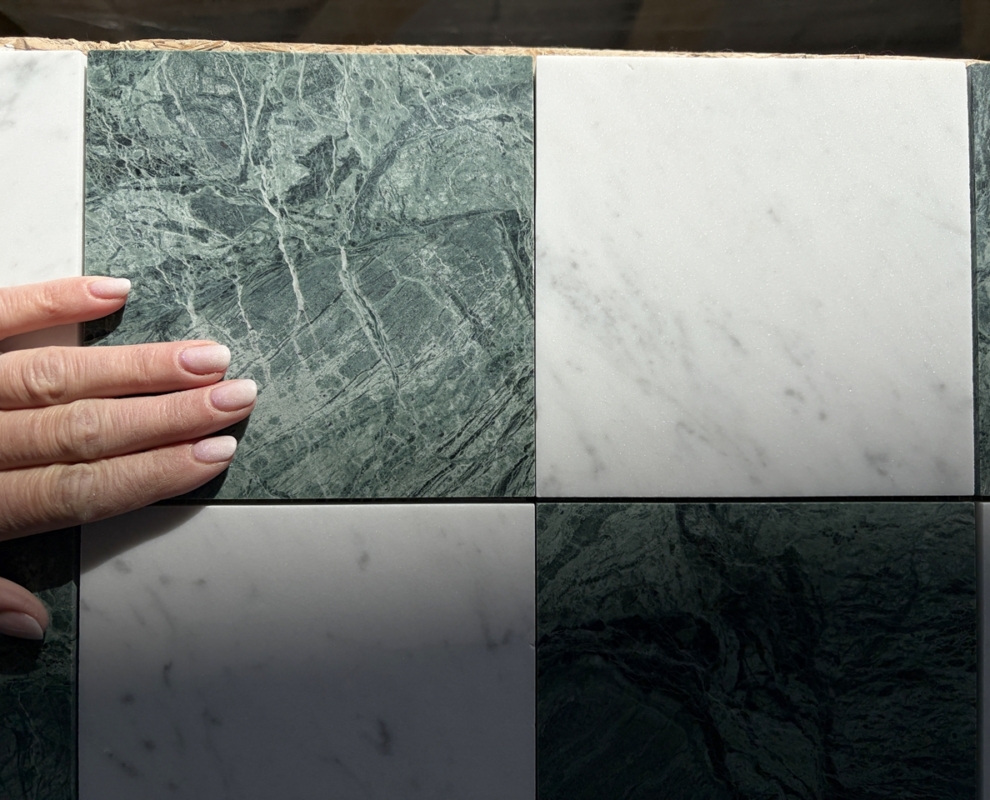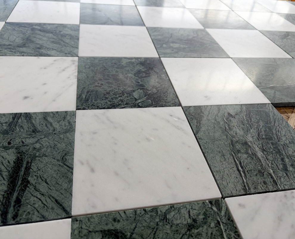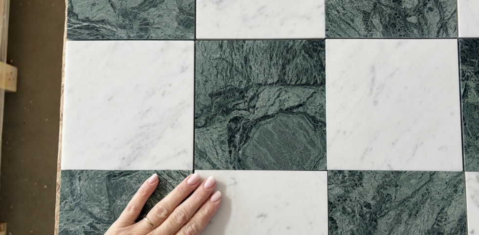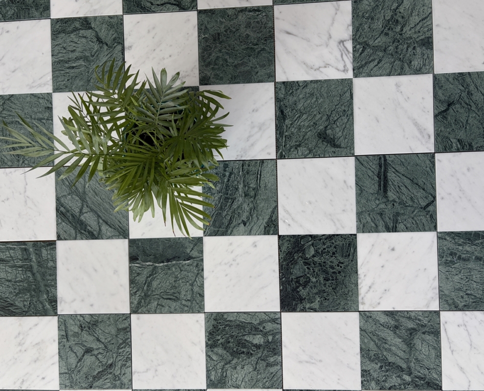 Szachownica Mini Verde – to połączenie dwóch marmurów, zielonego Verde Guatemala i białej Carrary. Piękna, mała szachownica na siatce. Po cztery kafle na siatce. Łatwa w montażu. Matowy, stonowany zielony i jasnoszare smugi na białym marmurze tworzą bardzo eleganckie i świeże połączenie.